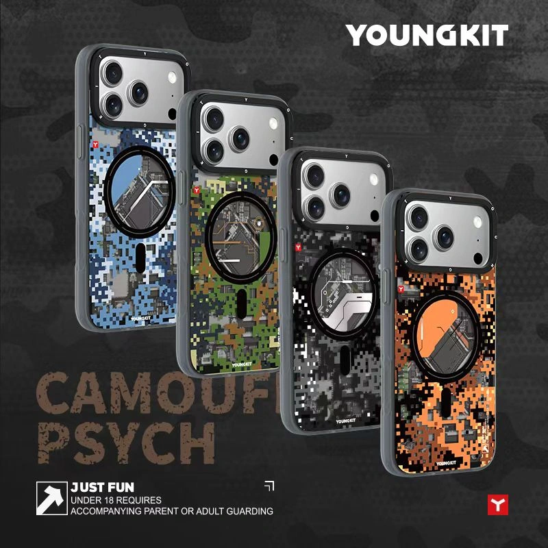 قاب آیفون 17 پرو برند YOUNGKIT مدل CAMOUF 3D | محافظ حرفه‌ای با طراحی دیجیتالی نظامی و پشتیبانی از مگ‌سیف ⚙️