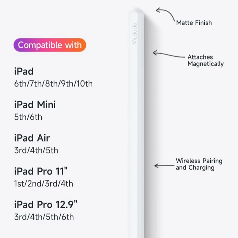 قلم مک دودو مدل PN-8921 به طور ویژه برای آیپدهایی طراحی شده که از قلمهای مغناطیسی پشتیبانی میکنند و به لبه آیپد بهصورت مگنتی متصل میشوند ⚡. به لطف این ویژگی، میتوانید قلم را بهسادگی به بدنه آیپد بچسبانید تا همیشه در دسترس باشد و بدون نیاز به کابل اضافی آن را شارژ کنید.